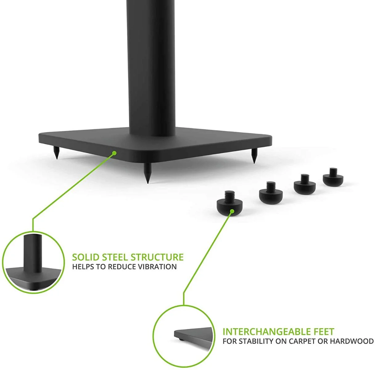 - INTERCHANGEABLE FEET - Spiked feet are provided to keep the stands securely planted on carpet. To avoid damage to hardwood flooring, domed rubber feet are also included.